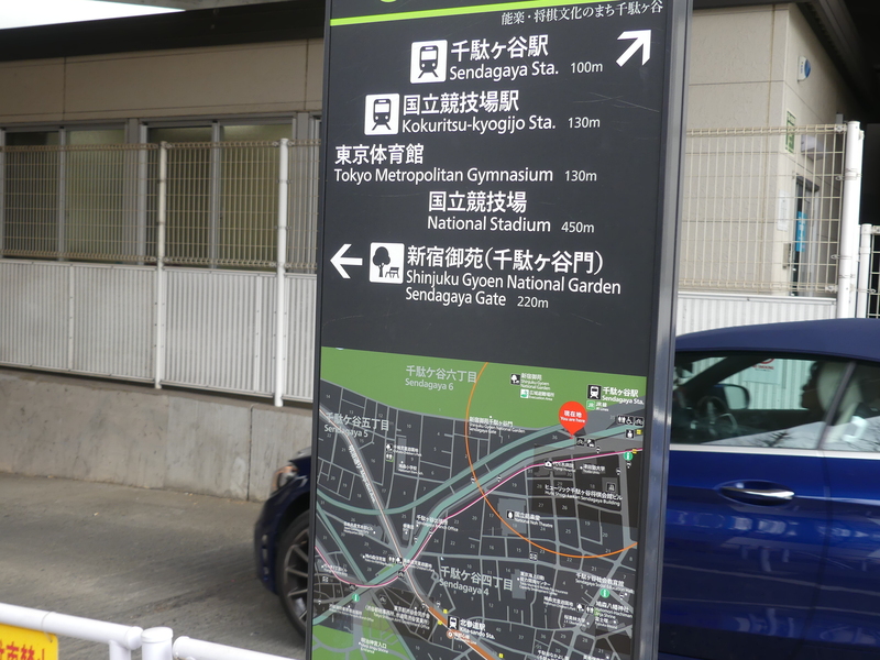 千駄ヶ谷駅、左に国立競技場(東京体育館)を見る大きな広場、駅員さん「とにかく右折して・・・・・」一言、有料駐車場が続き、トンネルにはいる道が新宿御苑 千駄ヶ谷門行き