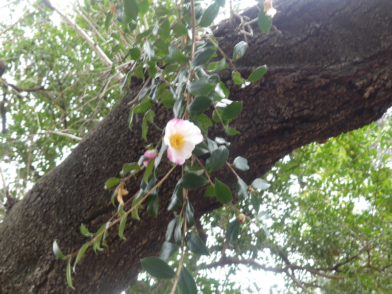 左:サザンカ 右:バラ花壇を一望
