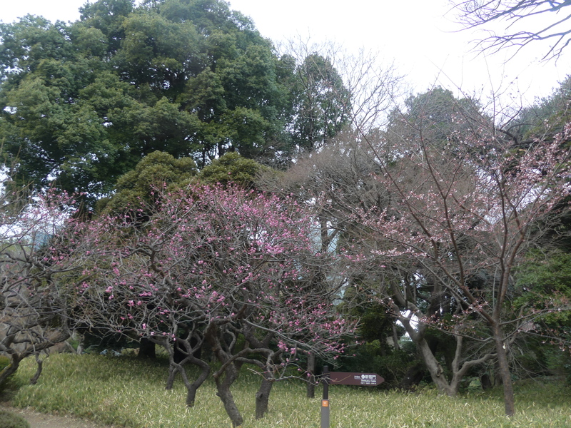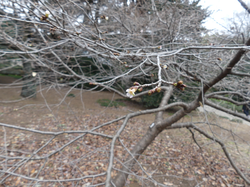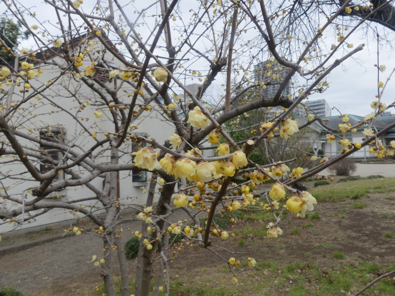 新宿門方向に進むとロウバイとサクラが咲いている、寄って見るとご夫婦が楽しそうに見ている、ロウバイには2種類あってこの違いを彼らが説明してくれる、大体の事は知っているつもりだが・・・・・ソシンロウバイは花芯に赤みが無く、ロウバイは赤芯タイプだそうです。