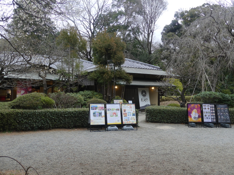楽羽停(茶室)の前にでる、ちょっと高台ですが上の池は木々が茂り、裏の梅園の回る、咲き誇る白梅は一番奥で紅梅の裏になる。