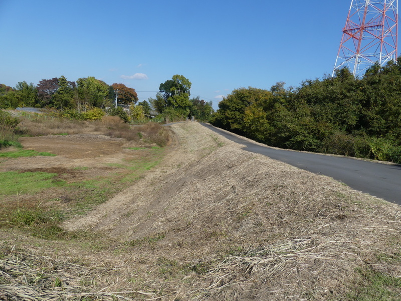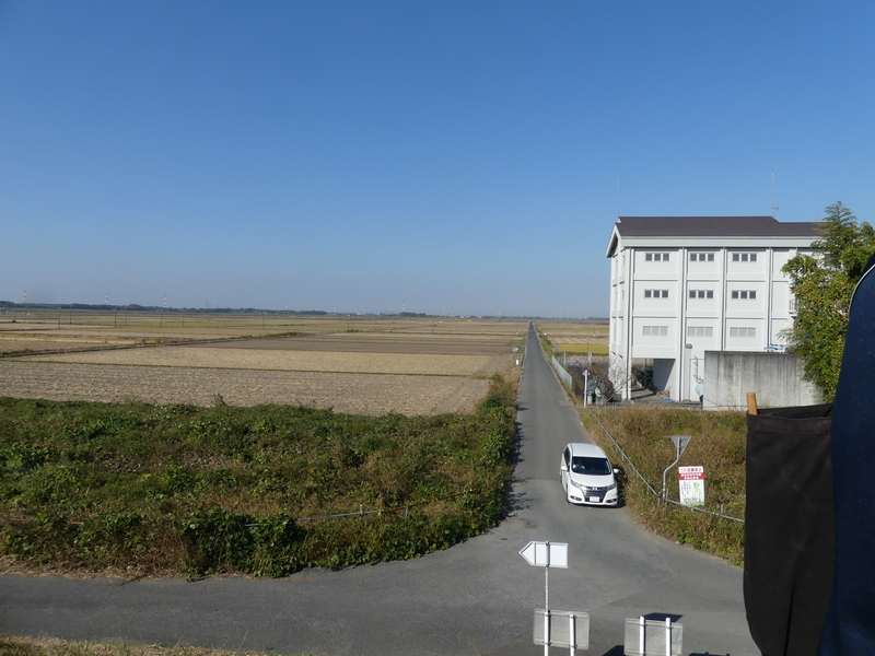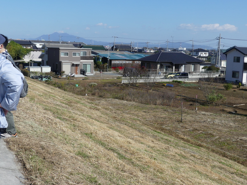 土手の右方向は広い田んぼ、ここは小貝川・鬼怒川を分離させ開拓したが小貝川が氾濫した場合は埋まってしまう土地で、10年前の常総市の洪水では大きな被害を受けたそうです、小貝川は見えませんが遠望の林が関東鉄道常総線と国道294号が走っています。