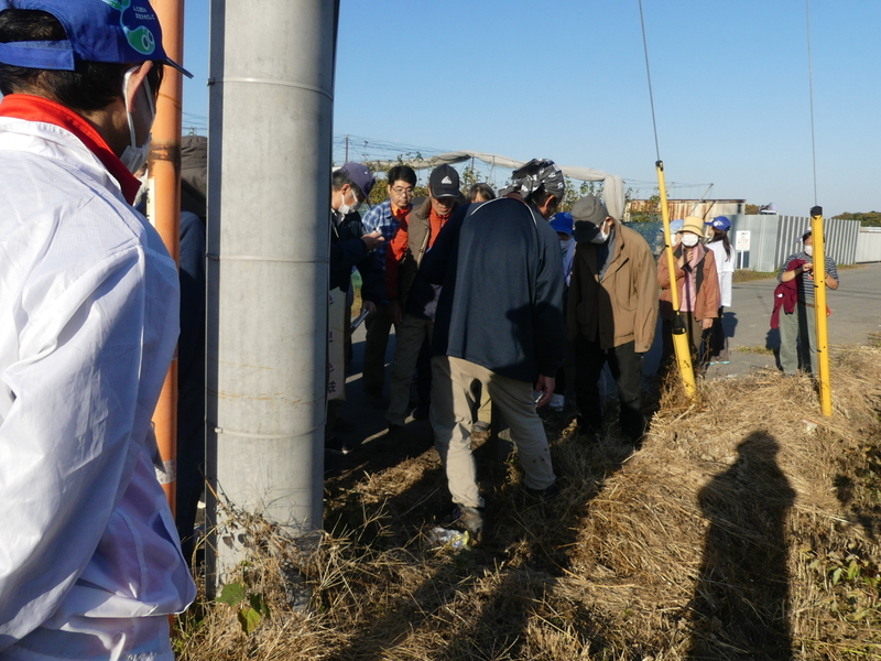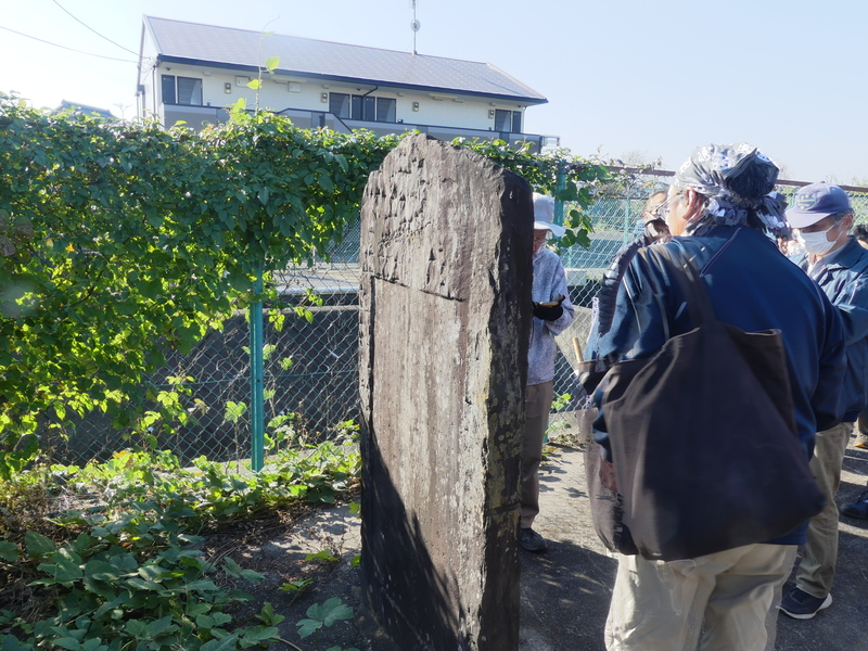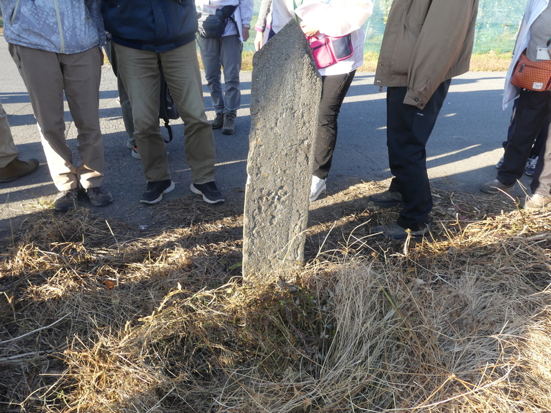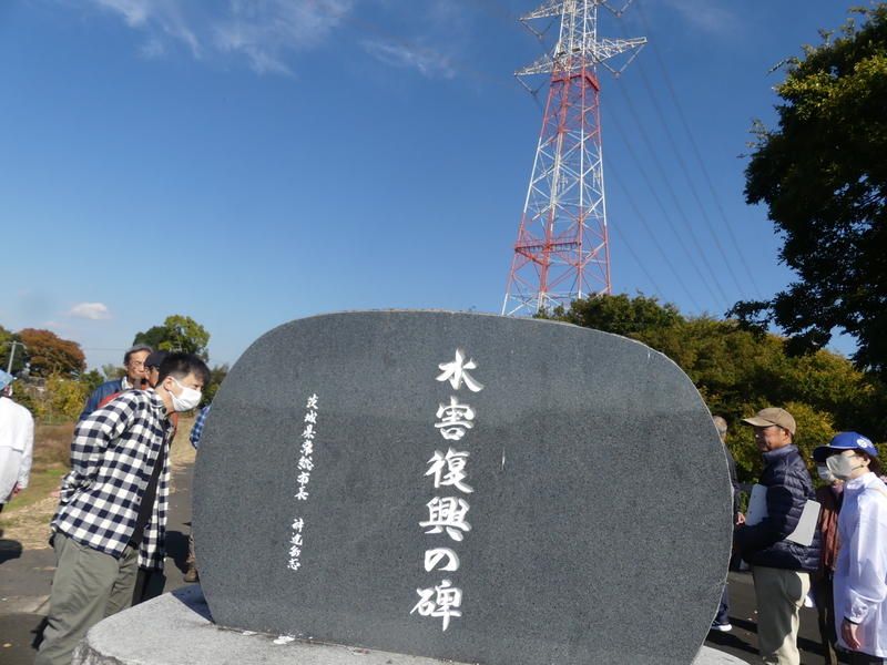 次は国道294号を北上し関東鉄道常総線小絹駅の近くで右折、鬼怒川と小貝川の合流地点西の台団地へ向かう、1629(寛永6)年の井戸田と羽根野の合流で掘削し鬼怒川と小貝川に直接合流させた、瀬間道を進むと奥まった地点で降り、矢野先生が大きな石碑の前で説明が説明を始める、ここに四ケ字水樋官を通じ小貝川に鬼怒川の水が抜けたそうです。石碑には昭和2年文字が読め、堰の立った年の様です。