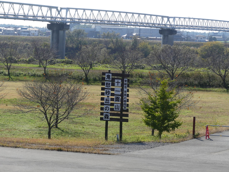 次は若宮戸砂丘(県道357号)へ、土浦境線を通過、石下橋を左に見て進む、十一面山として知られている、砂丘上に.建てられた戦没者慰霊塔が建ってよく目立つが、3列の砂丘列があり、周囲の台地(標高22〜25a)より高い32.25の標高が有った砂取りにより砂丘の多くが失われた。