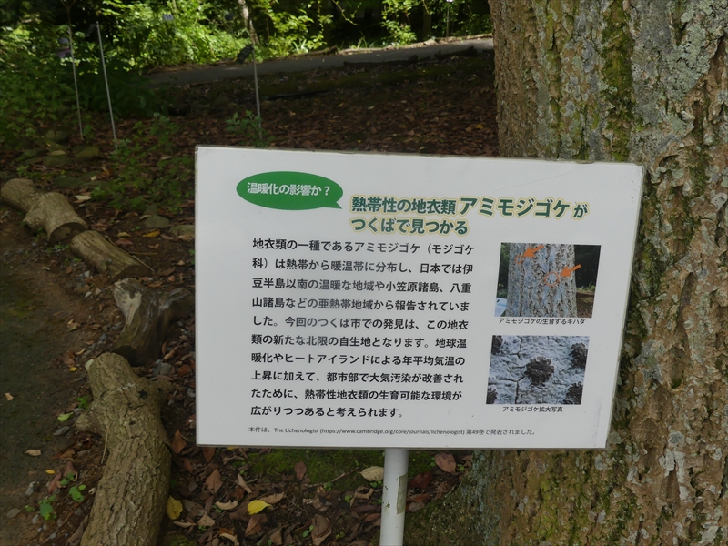 これからつくばね橋に・・・入る林の前のキハダの幹にアミモジゴケと拡大用メガネがある、説明によると温暖化の影響からか熱帯性の地衣類アミモジゴケがここで見つかった様です。一度拡大用メガネで見ておきたいコケです。