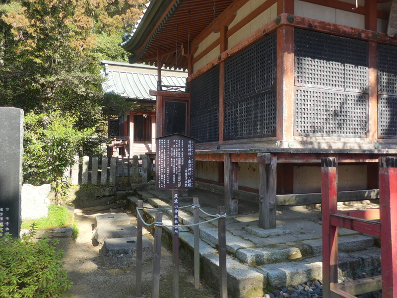 左:筑波山神社のマルバグス 右:日枝神社と春日神社 まもなく白雲橋を渡る、階段を登ると筑波山神社の境内に入り日枝神社と春日神社の裏に登り、可愛い「三猿」(聞きたくない、言いたくない、見たくない)を見る、表に出ると筑波山神社のマルバグスと日枝神社、春日神社の表に出る。